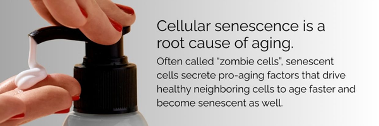 As more senescent cells accumulate, your skin experiences accelerated skin aging, including visible signs like wrinkles, loss of firmness, crepiness, and thinning. That's not the worst of it; the more cells become "infected", the body experiences increased inflammation, suppressed function of the immune system, and increased expression of pro-aging genes.