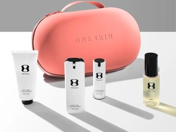 CONTAINS: OS-01 FACE (15mL), OS-01 BODY (60mL), OS-01 EYE (7mL), PREP (50mL), and an exclusive One-Skin travel bag